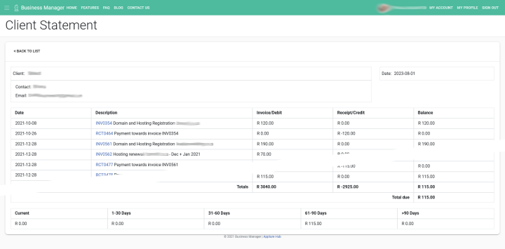Often a Client wants to see what they have paid and what is outstanding. After you have receipted their payments you can easily generate Client Statements and Aging reports. The Client Statement includes an Aging table and automatically contains your business Letter Head and Terms and Conditions.