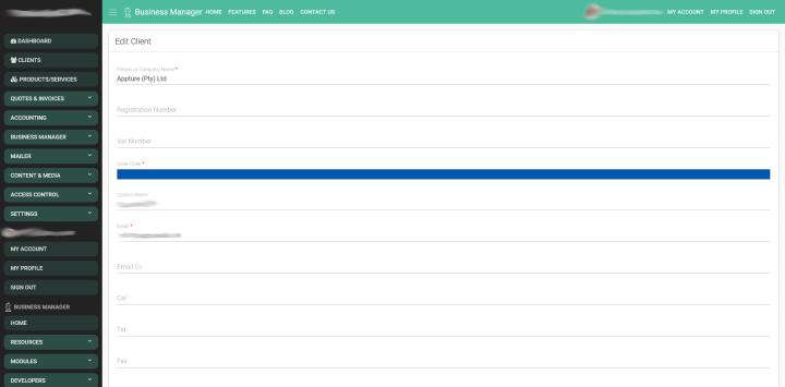 This module allows managing your Clients, Products or Services, Accounts (think Cash Book or FNB Bank Account) and Employees*. Fill in once and reuse throughout the Business Manager platform.