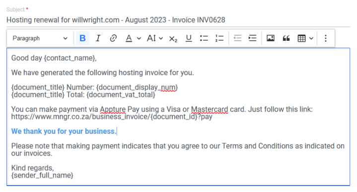 Stop retyping or copy and pasting existing information. Use placeholders to insert Client and Document data into your messages.