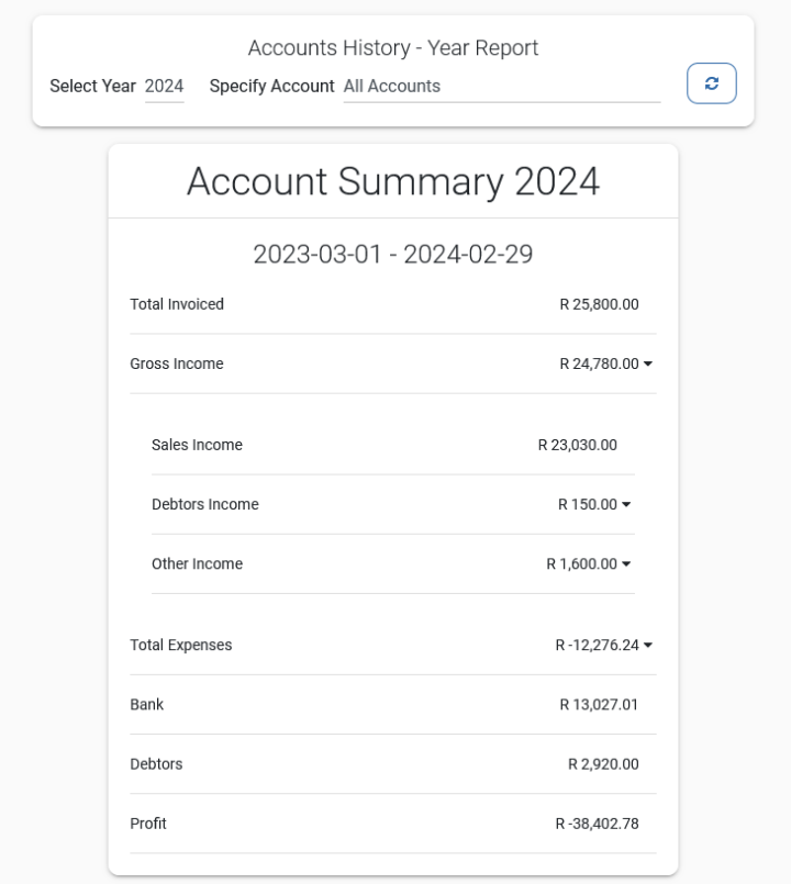 With all your Income and Expenses on the system you can view your Account History Report to get a full year overview of your spending. This report has been created with SARS Year End Financial reporting in mind. Keep your Account history up to date and easily fill in your Income Tax reports through SARS eFiling using the generated Report.