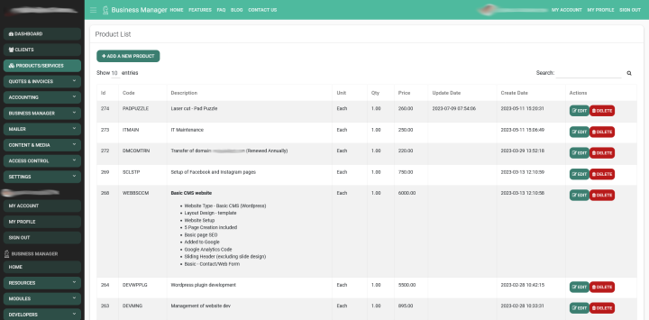 This module allows managing your Clients, Products or Services, Accounts (think Cash Book or FNB Bank Account) and Employees*. Fill in once and reuse throughout the Business Manager platform.