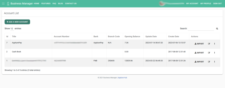 List your Business Accounts in order to link your Income and Expenses. This allows generating Account summary statements so you can manage your spending more effectively. Business Manager can automatically import your account history for a linked Appture Pay account. (Generating Expenses and Receipts requires an Accounting module subscription).